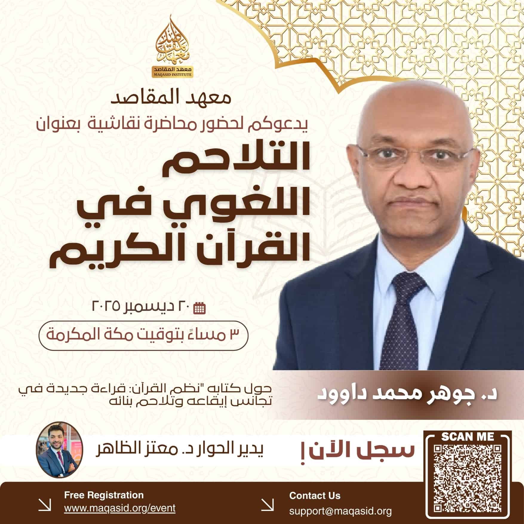 هذه الندوة ضمن سلسلة لقاءات المنتدي البحثي الذي يقدمه معهد المقاصد بهدف تعريف الدارسين في الحقل القرأني بأطروحة الدكتور جوهر داود حول التلاحم اللغوي في القرآن الكريم على مستوى الوحدة البنائية الأساسية وهي “السورة” ، وبيان تفرّد كل سورة بخصائص لغوية على مستوى الكلمة المفردة وعلى مستوى التعابير المركبة مشكلة علامة للسورة تميّزها عن ما سواها
